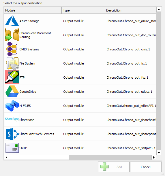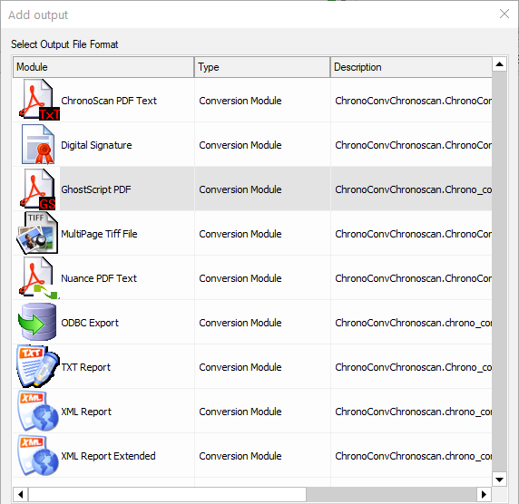On the Add Output window it is possible to create Output Format and Destination pairs using several different formats and destinations allowed by ChronoScan.
