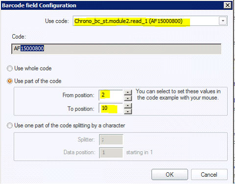 On the Barcode Field Configuration window use the Use Code dropdown menu with the modules and barcodes read to select the desired barcode. Select module1-code1. On this case, we want to use the whole code: