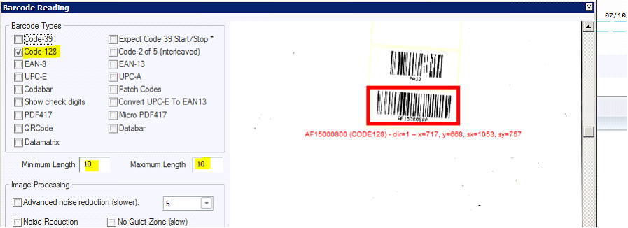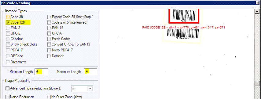 Select only Code128 and Minimum and maximum length of only 4 characters.