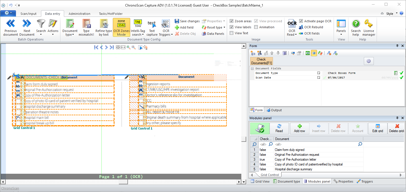 Two instances of Grid Control 1 were created to capture all of the desired checkboxes. The Checkbox field will be used to capture the checkboxes and the Document field will be used to capture the document name.