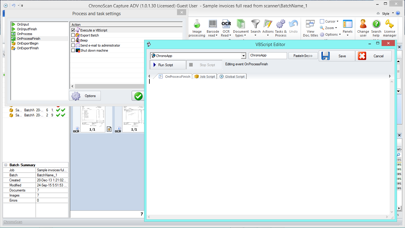 For advanced users that want to add custom processes to their data entry process we have added the ability to execute VBScripts when an event occurs on ChronoScan. The first version allows execution of a VBScript every time a field value is changed by the user or by one of the process modules (OCR, Barcode…). The advantages of using a VBScript are that you can do almost everything with the data inside ChronoScan. Some examples are: