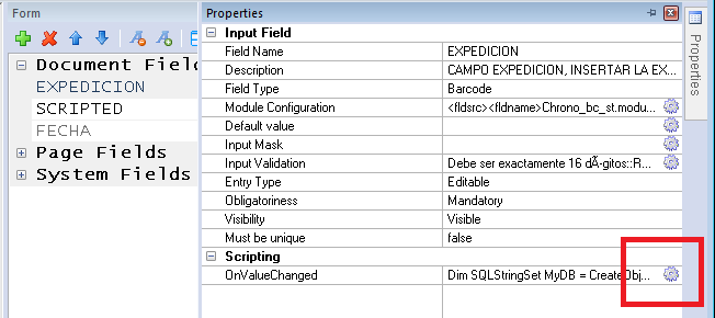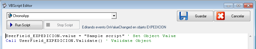 This SQL is built by searching for the actual value in the field EXPEDICION. The fields are represented on VBScript as UserField_FIELDNAMEONCHRONOSCAN. Spaces and illegal VBScript symbols are replaced with “_”.