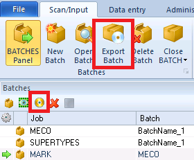 When you finish scanning and/or processing your Batch, you will want to export the extracted data. This is done through the Export Batch button on the Scan/Input Tab or in the small CD icon () on the Batches Panel: