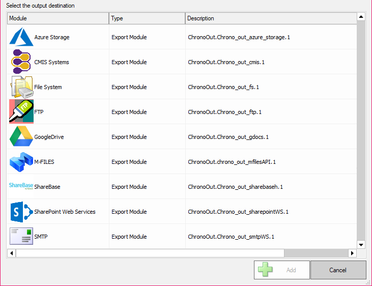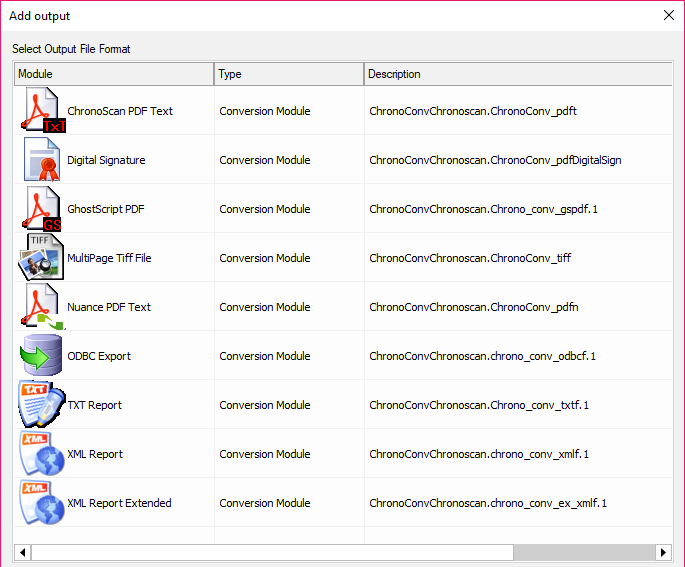 Exporting Batches is the process of converting and sending the extracted data from ChronoScan to an output destination on the desired format. In order to perform these operations there are two types of modules, the conversion module and the destination export module. Both can be found here: