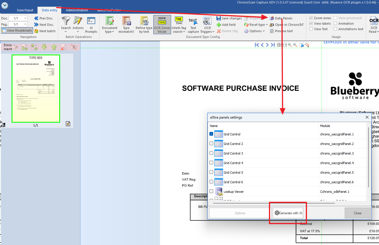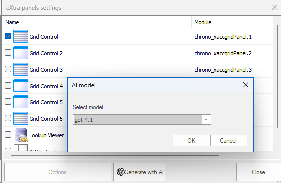 The eXtra Panel dialog (data entry >> data panels) includes a new “Generate with AI” button, as shown: