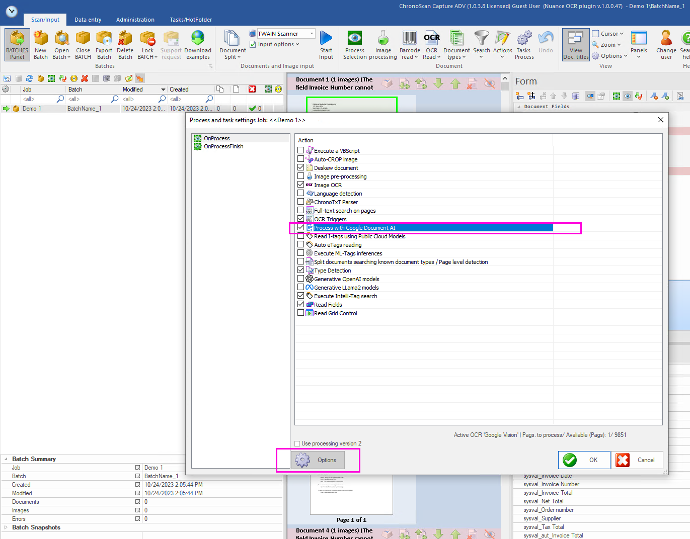 The process configuration dialog will open. Locate the "Process with Google DocumentAI" option, click on the checkbox to enable it and then click on its name enable the "Options" button