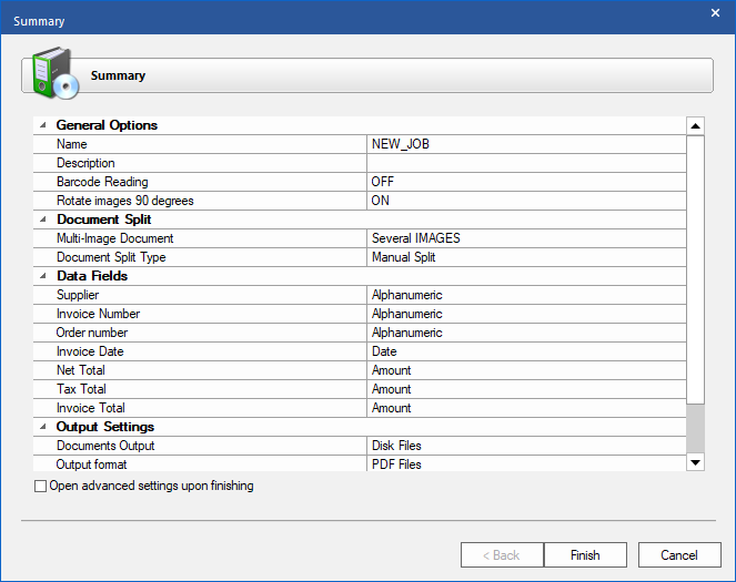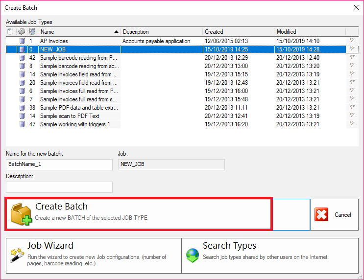 9 - Now that we have a Job Type setup we can start scanning and processing images. When you click Finish, you can click on the Create Batch button to create a new Batch using the created Job. Click on it to create a new Batch with the desired name and description. You can use as many Batches as you want with the same Job configuration: