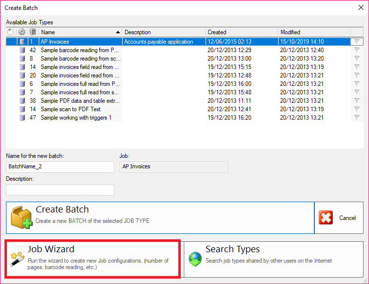 2 - On the New Batch Window use the Job Wizard to create a new Job Type: