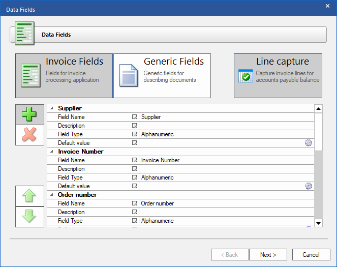 6 - Define the fields for your Job - you can use the default fields or insert your own - these fields allow you to associate data to every one of your documents and use it to be exported, name the files, set metadata/bookmarks on PDF files and much more. This configuration can be changed after the Job has been created: