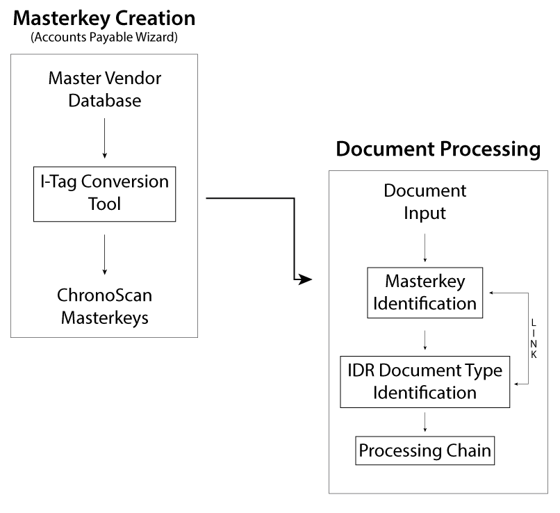 A masterkey setup will expand the functionality of ChronoScan by using static value Intelli-tags generated from a master vendor database provided by the user using the Accounts Payable Wizard to detect the supplier or vendor for each document. After the supplier/vendor detection takes place ChronoScan will then proceed to detect the document type using the IDR engine as normal.
