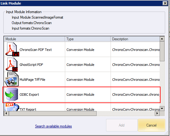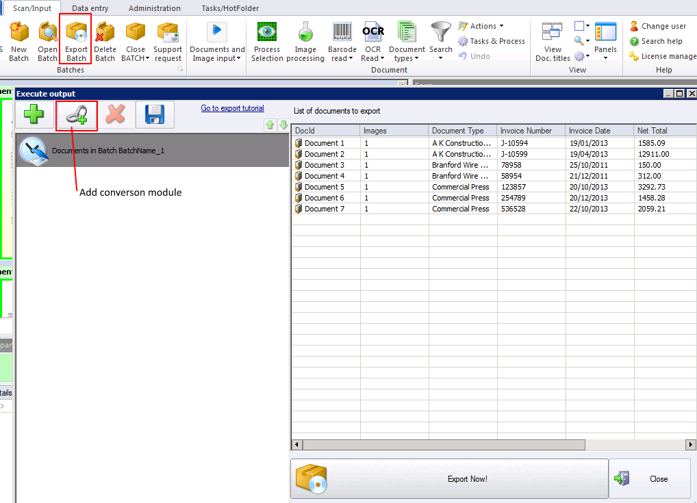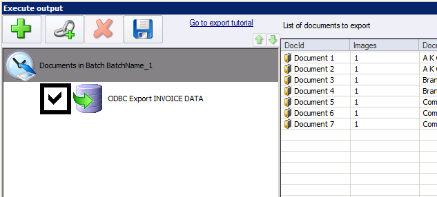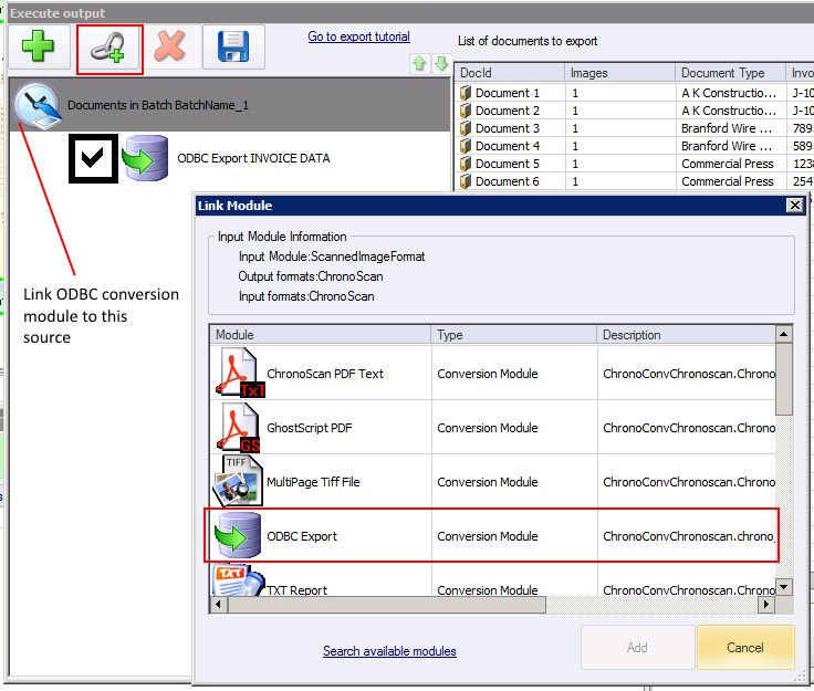 Once again add conversion module, selecting as source "Documents in Batch..." (is the source of our data) and ODBC Export