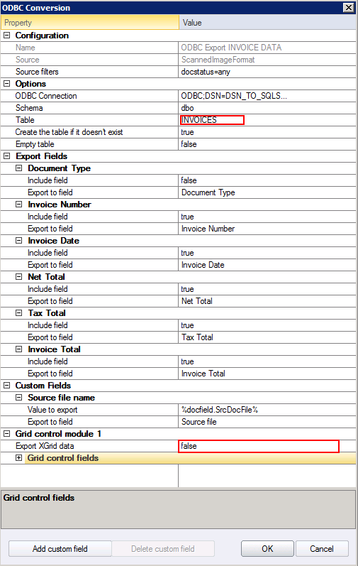 Configure name, connection DSN, table (e.g. INVOICES) and set to false "Export XGrid data"