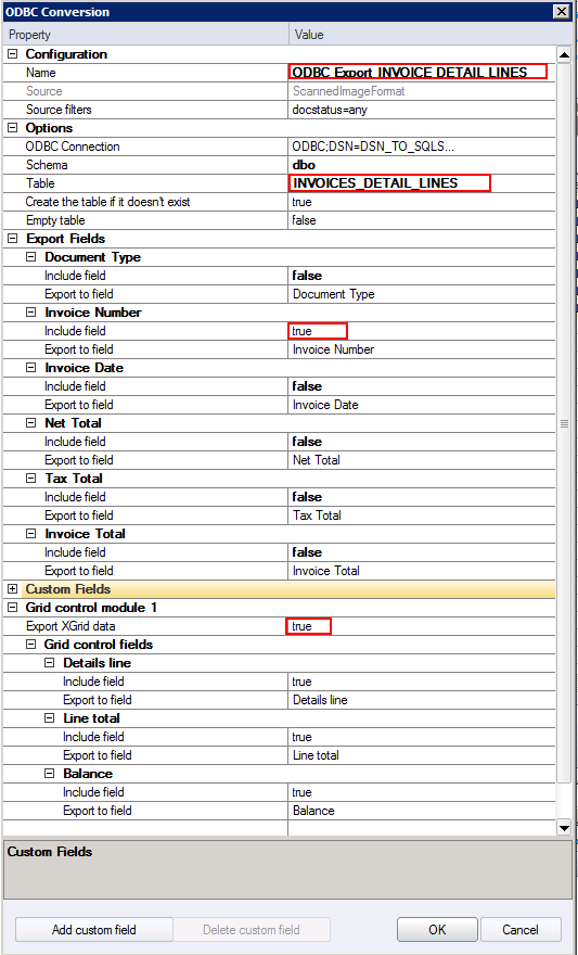 Sometimes is necessary to export the data to several tables. For example in invoices we can export header fields like invoice no, date, etc. to a table and the grid capture fields (detail lines) to another table. This is an example of how to configure two conversion data modules.