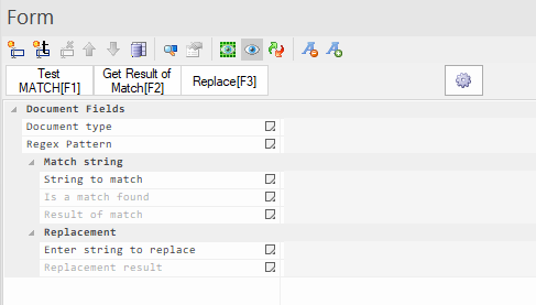 Test MATCH - This button tests the regular expression against the value on the String to match field. It returns TRUE or FALSE on the Is a match found field:
