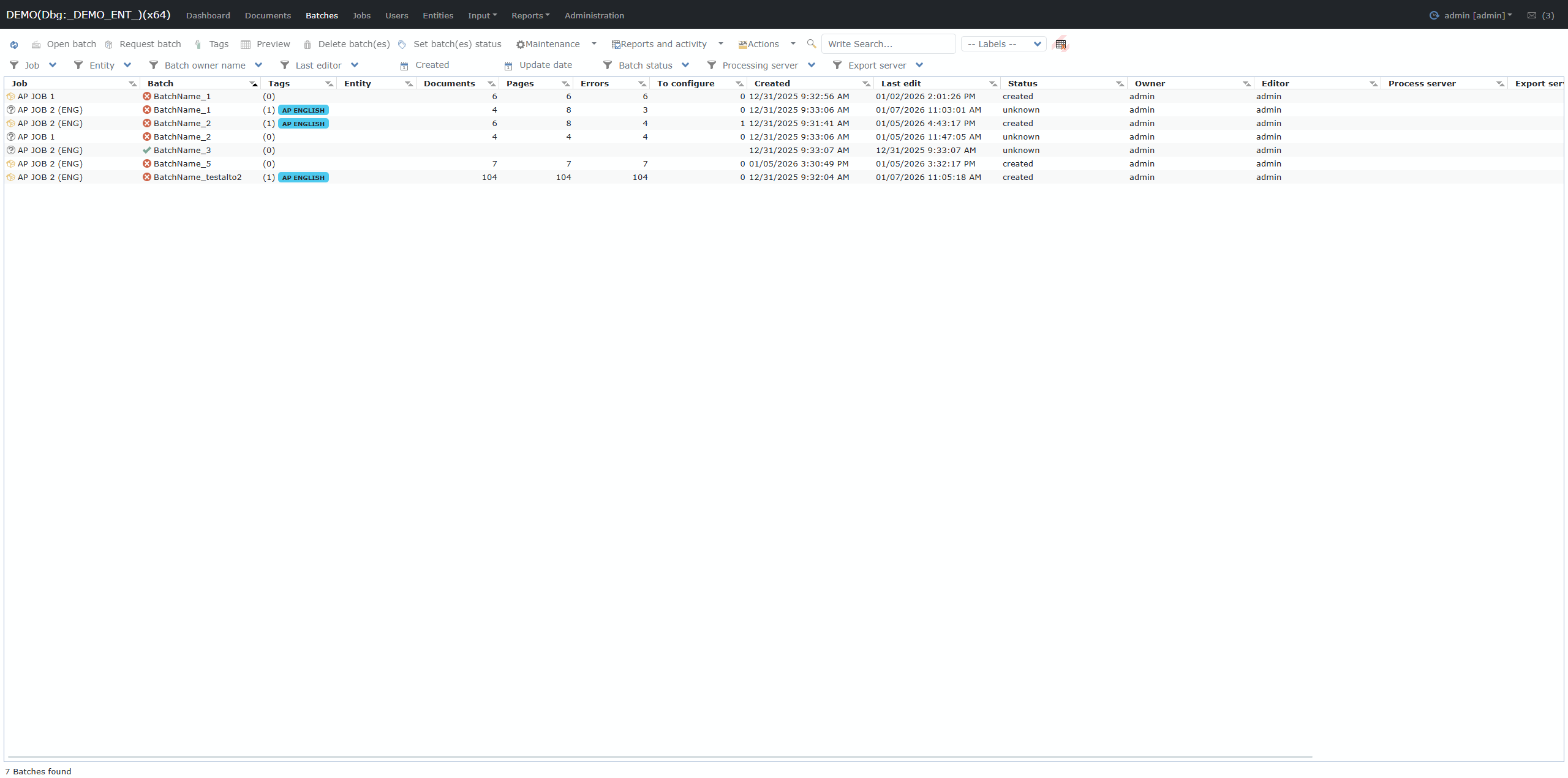 Job, Entity, Batch owner name, Last editor, Created date, Update date