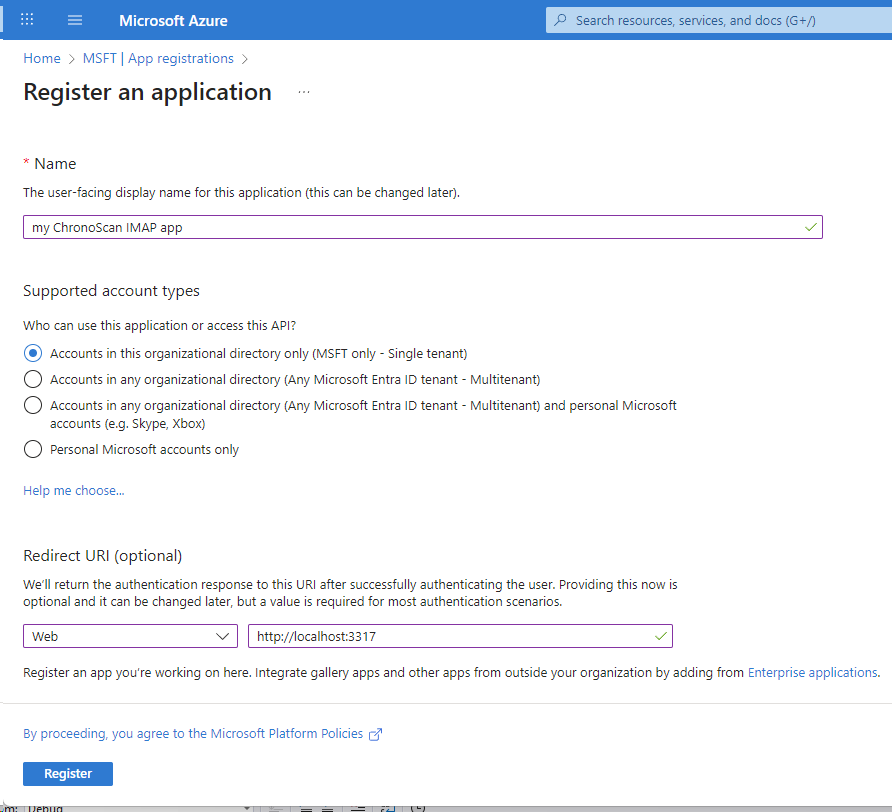 To configure a new Entra ID app registration go to AZURE Entra ID configuration - App Registration and register new application