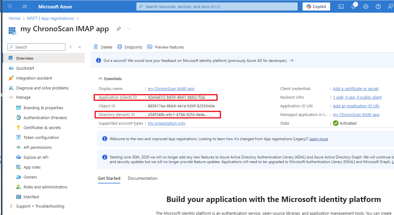 Now the application is created, you can get the Tenant ID and Client ID
