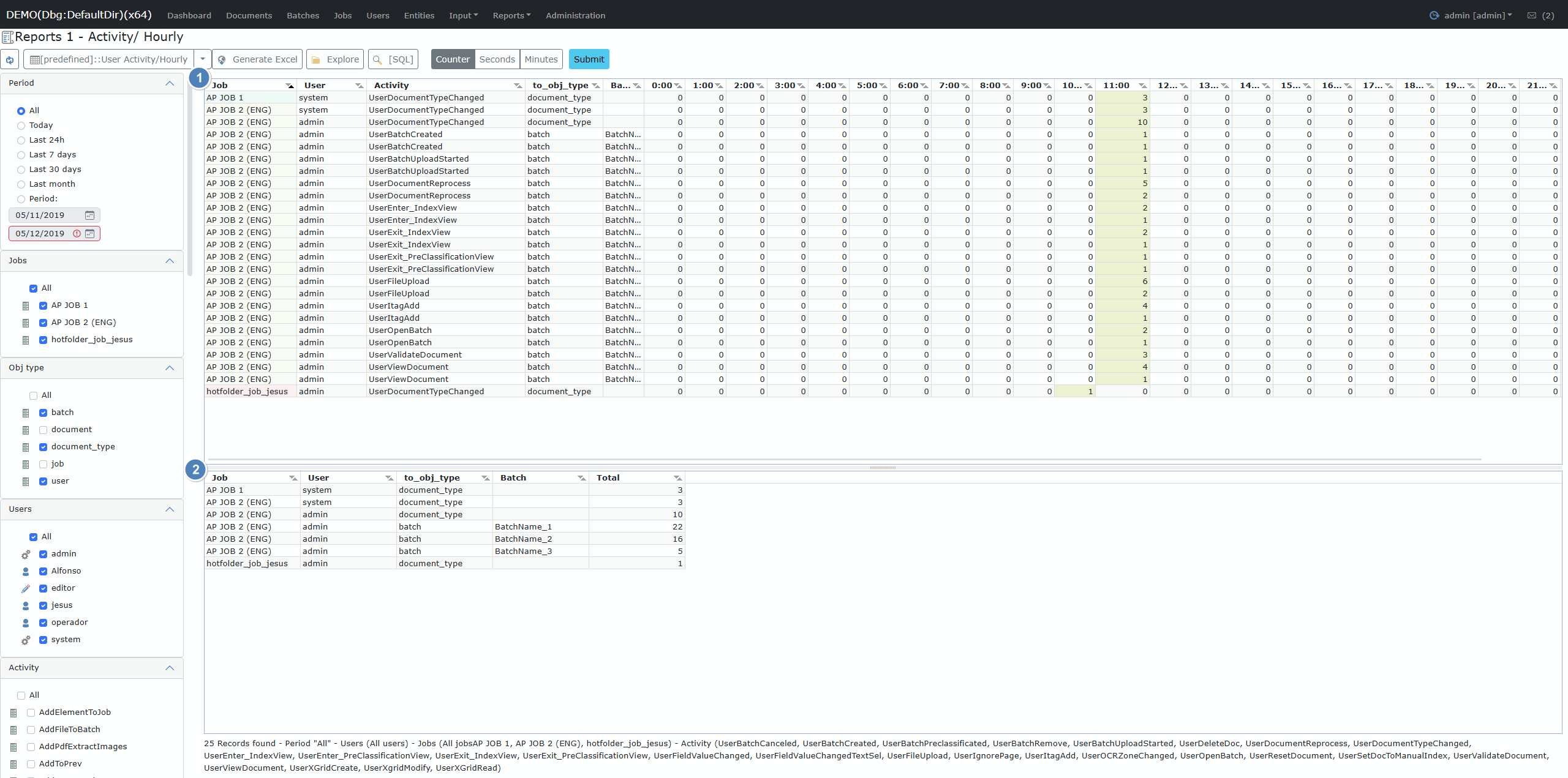 Filter activities by specific users or user groups.